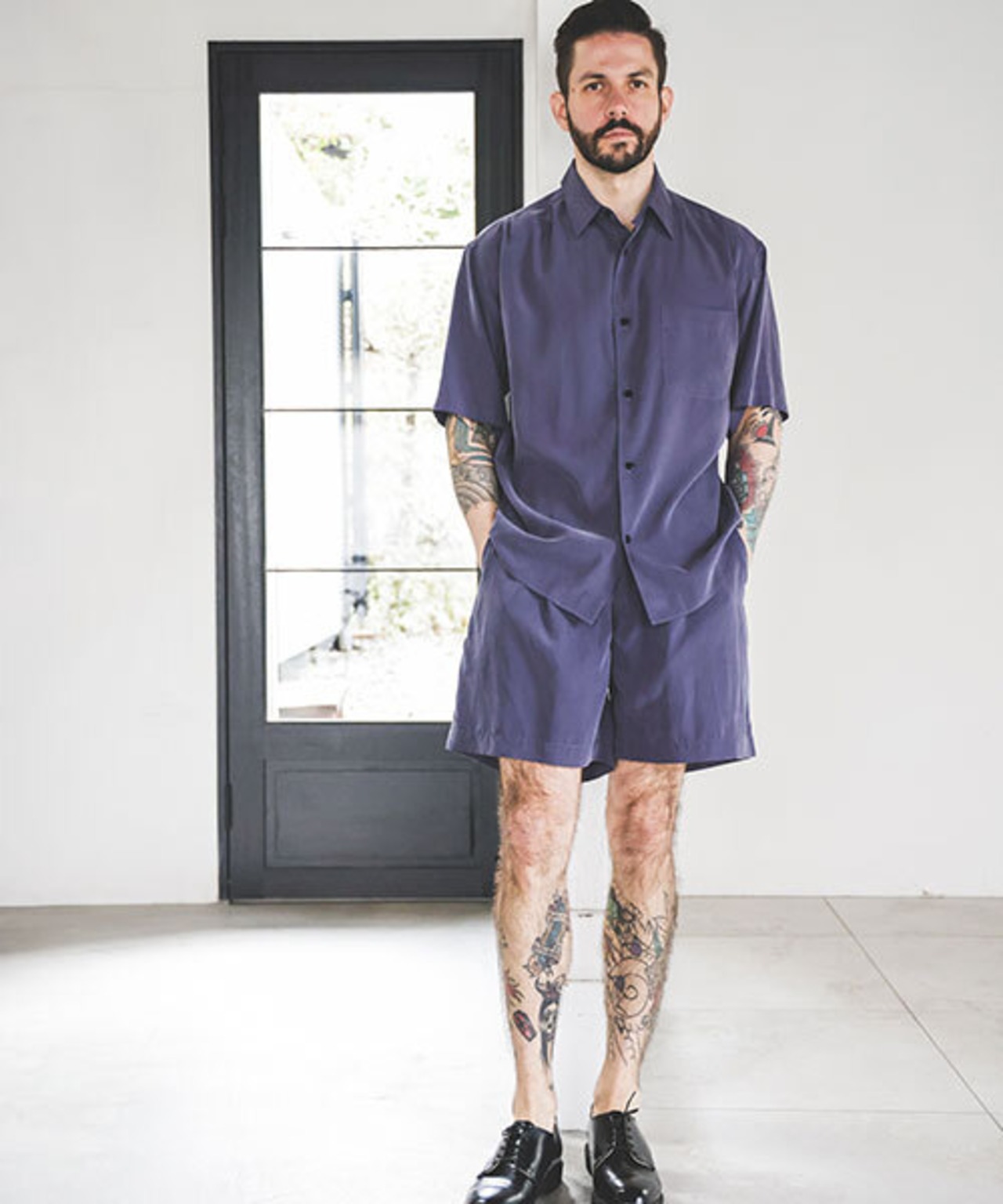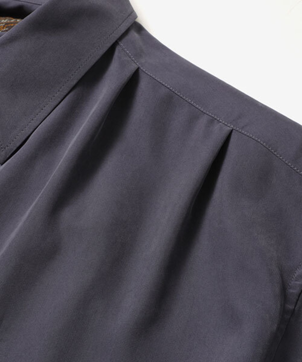 フロントショルダーとバックヨークにそれぞれ4箇所タックを入れ、ドレープ感を素材とシルエットでコントロールした半袖シャツ。