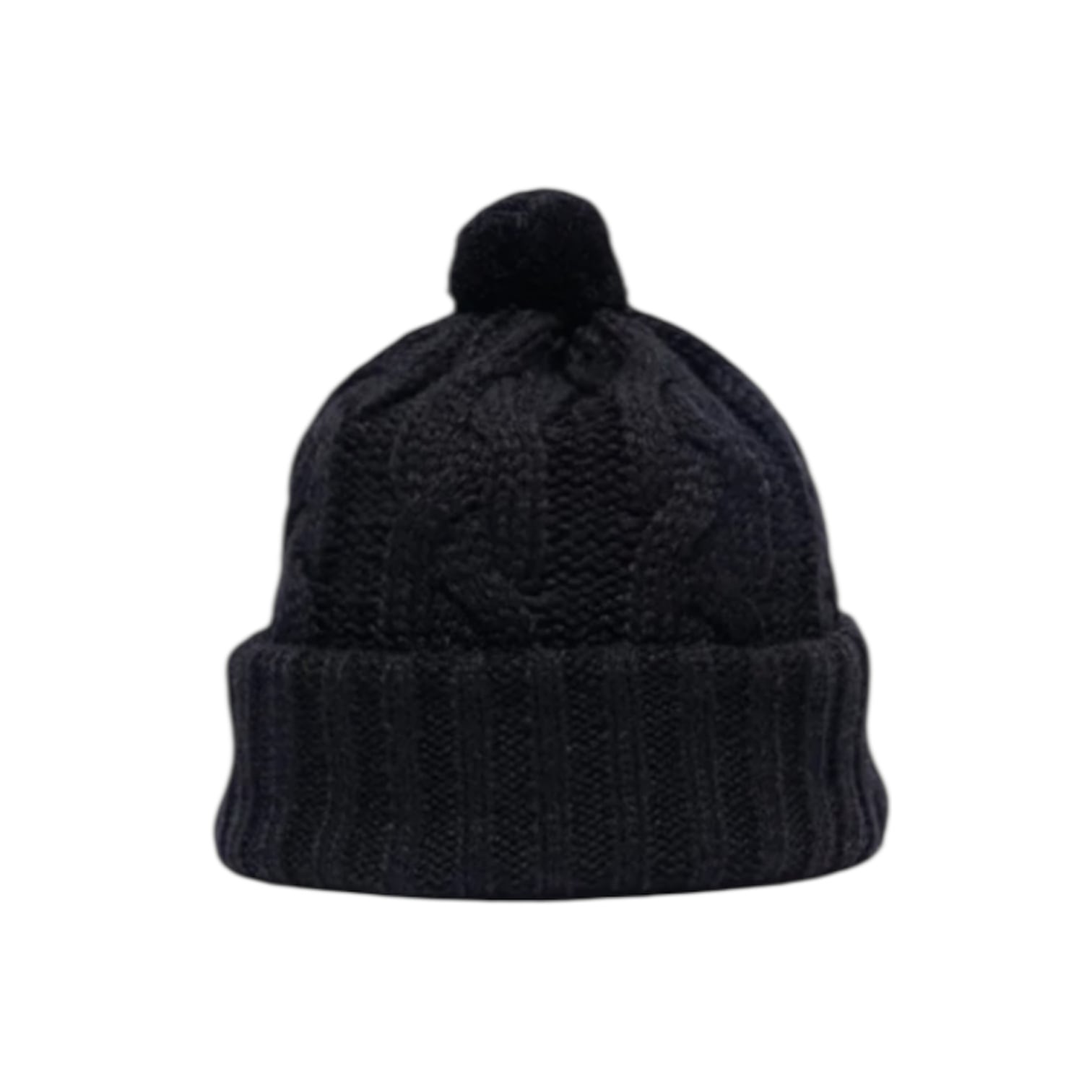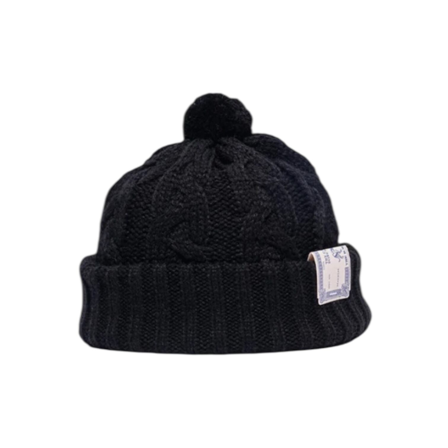 直径6cmのポンポンが付いた、ケーブル編みと折り返しリブを組み合わせたニット帽。