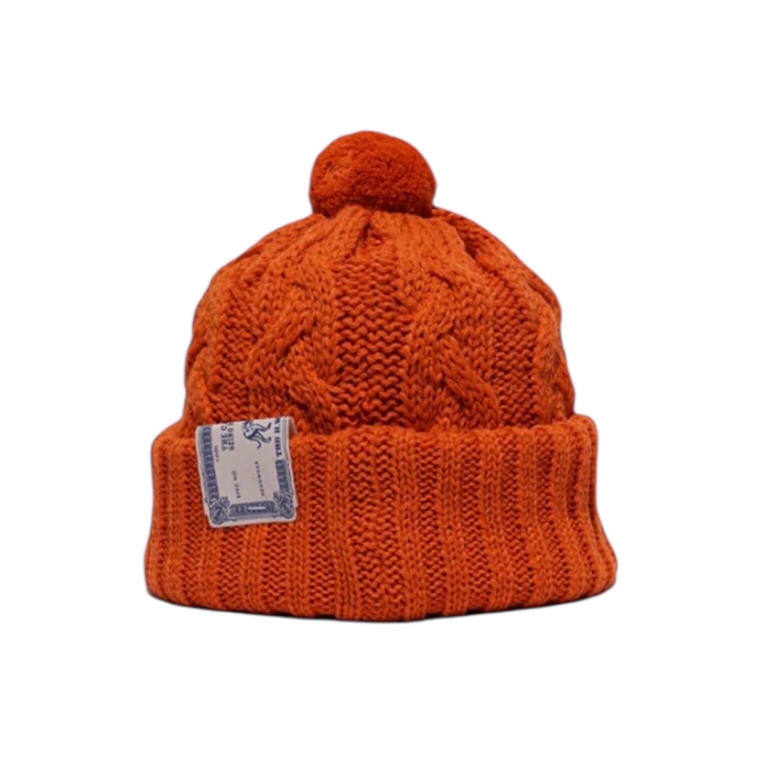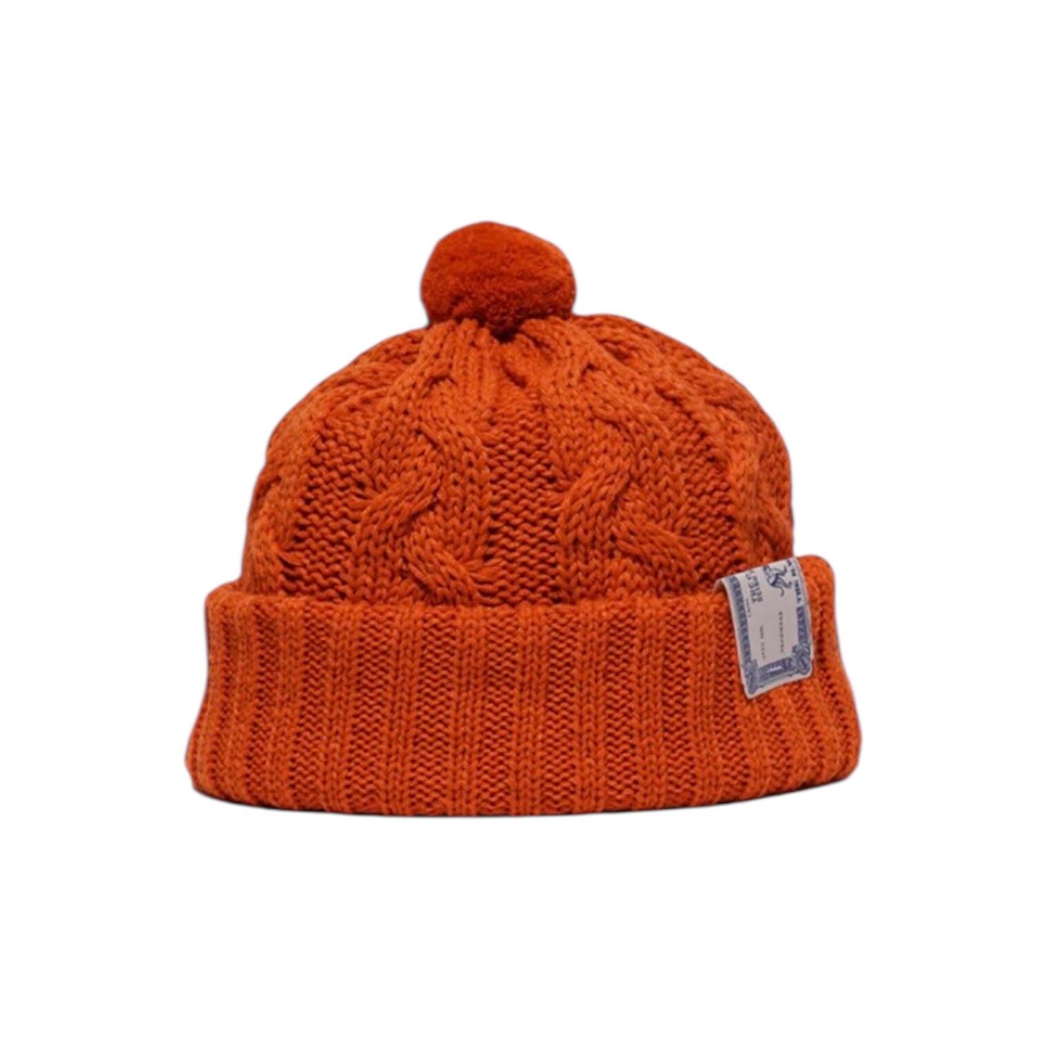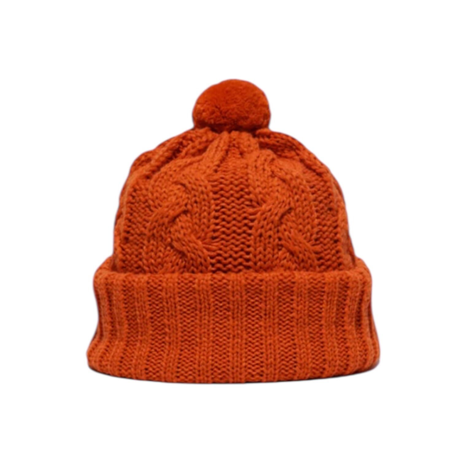 直径6cmのポンポンが付いた、ケーブル編みと折り返しリブを組み合わせたニット帽。