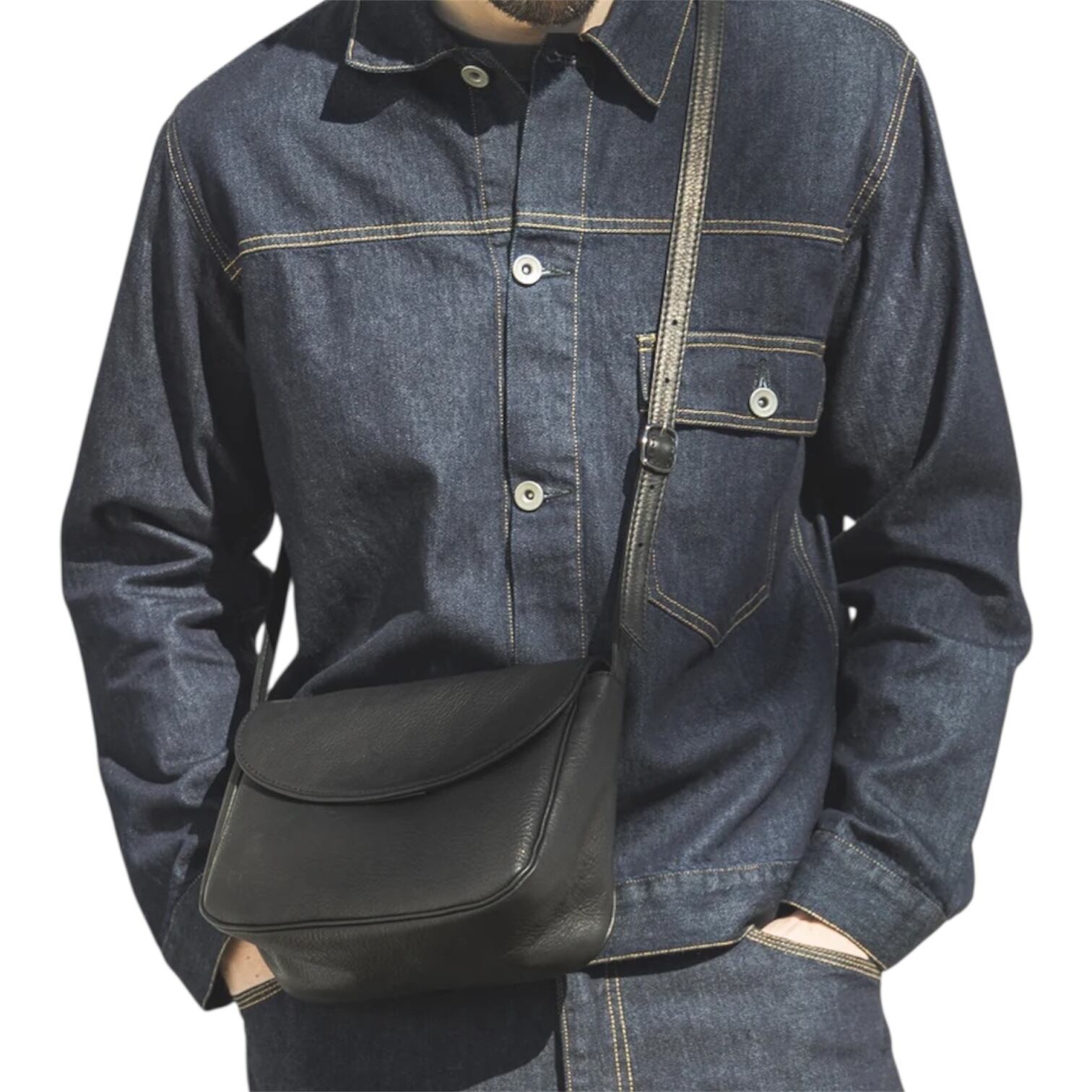 フラップ型のコンパクトなニートショルダーバッグ。マチを深く設定しているので、長財布、携帯、350mmペットボトルなど見た目以上の収納力を誇る。