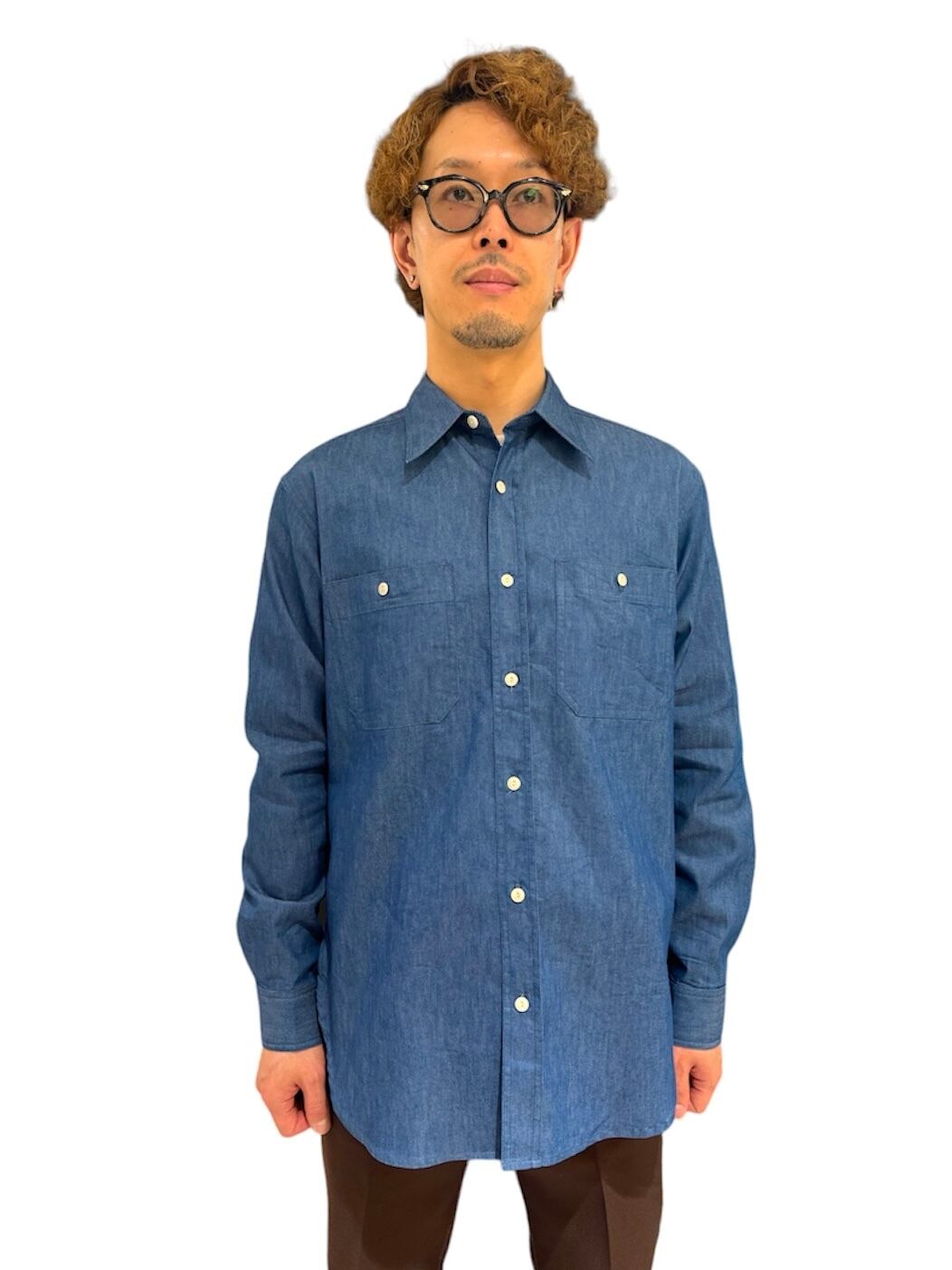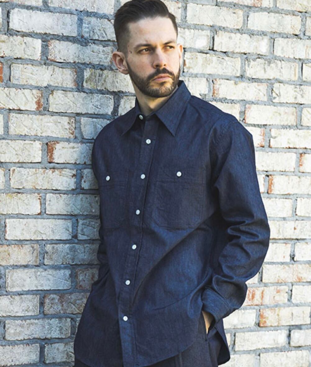 吸水速乾性に強いインビスタ社のクールマックを使用し、インディゴ染料で仕上げた機能素材。 綾織の特性上、横に対してのストレッチがあり着用感は抜群です。 デザインはパッチポケットタイプのワークシャツ。 襟の長い剣先、裾の深いラウンドなどクラシックなディテールで仕上げている。 ワンウォッシュ仕上げで洗濯後の縮みも軽減されている。
