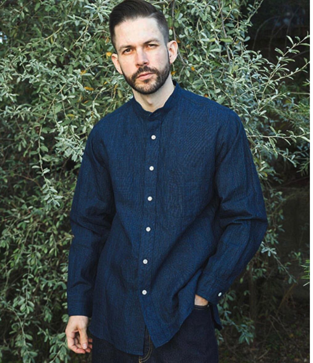 (クラシックパターンインディゴリネン / バンドカラーシャツ)