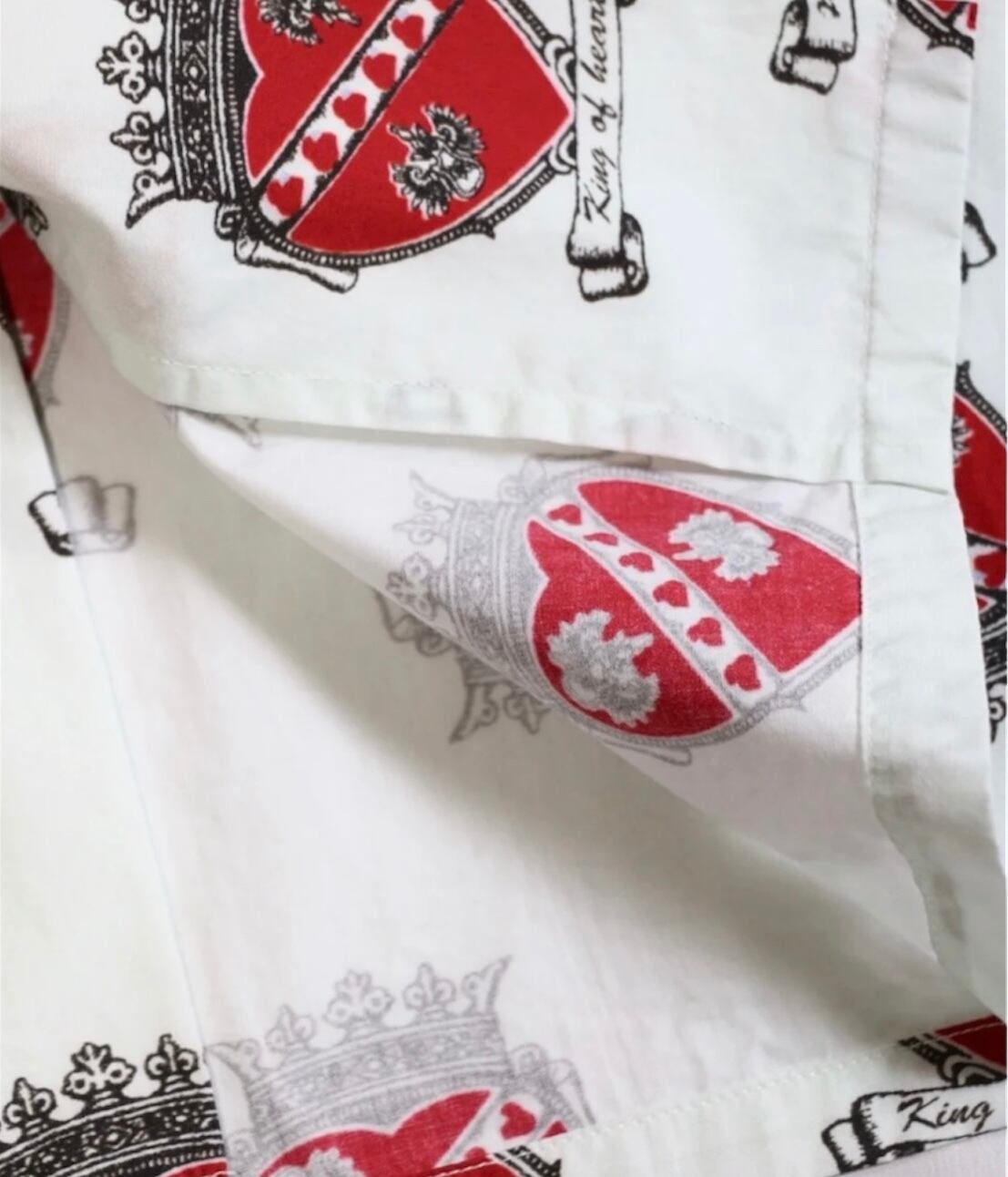プリントのモチーフは、ニルバーナ/カート・コバーン着用のアーカイブ資料からNICK&NORAのランチ・ハートクラウンの柄をインクジェットで再現しました