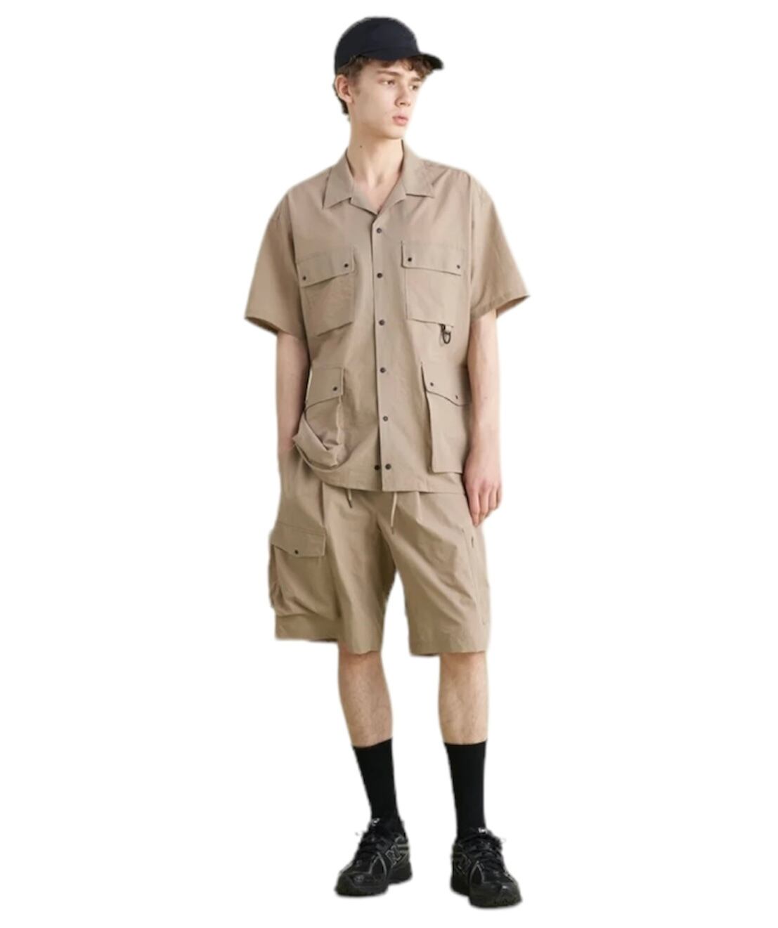 サファリシャツを連想させるような大きなポケットをフロントに4つ配置し、収納力、携帯性を向上