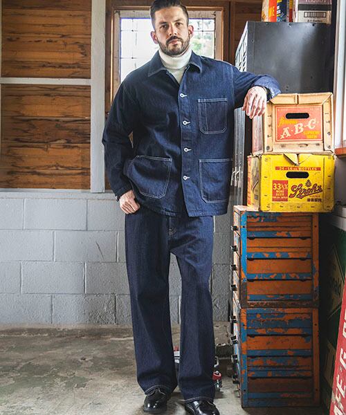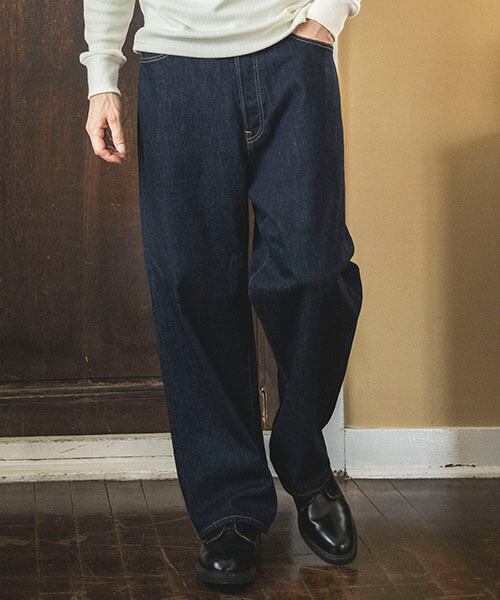 5ポケットジーンズをベースに股上が深く、太めながらもすっきりとしたワイドシルエットに仕上げたモデル。